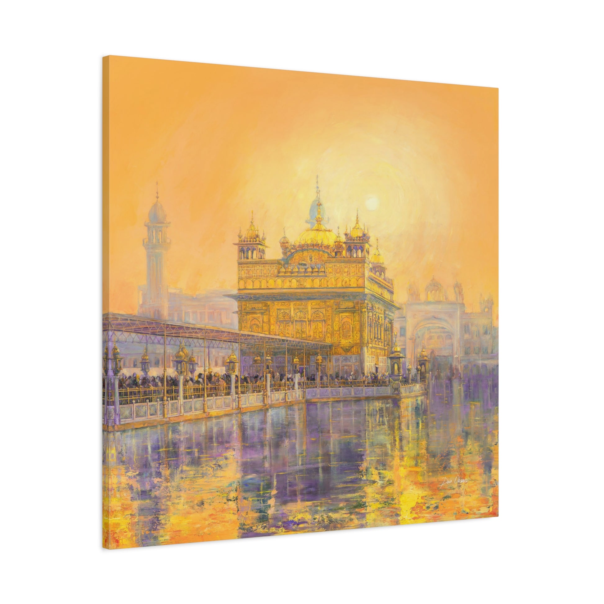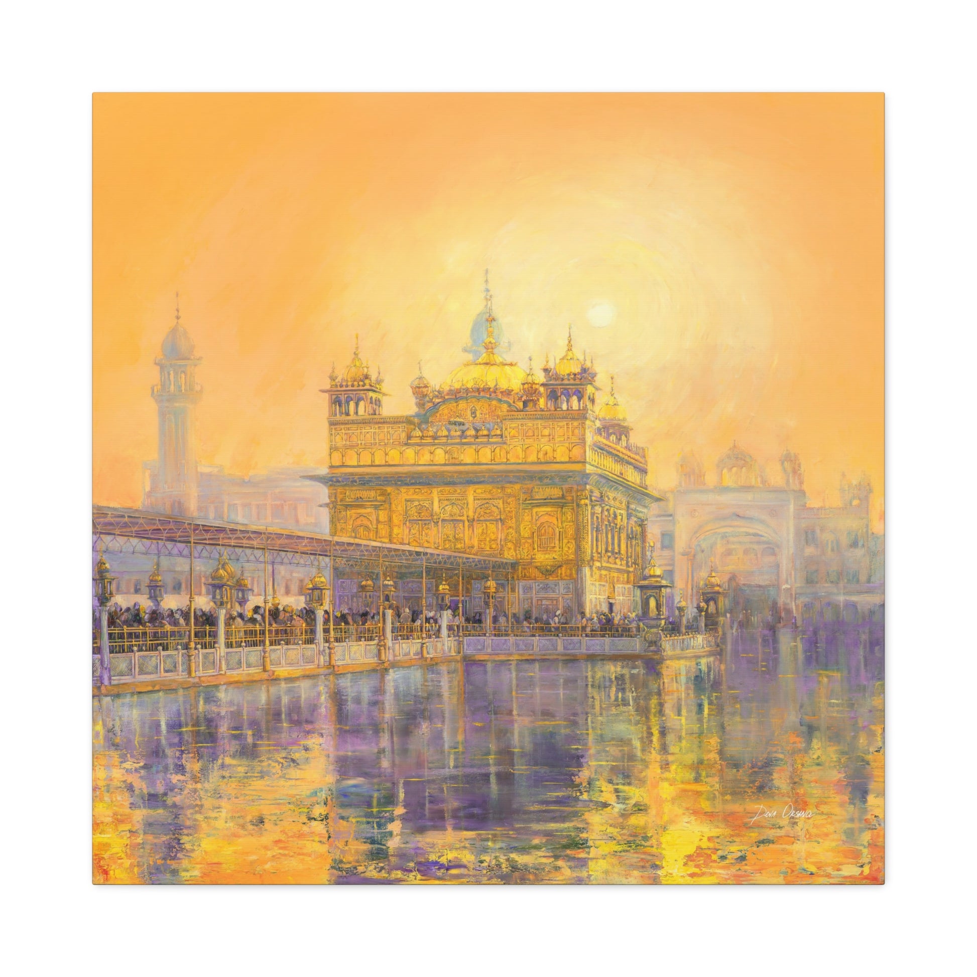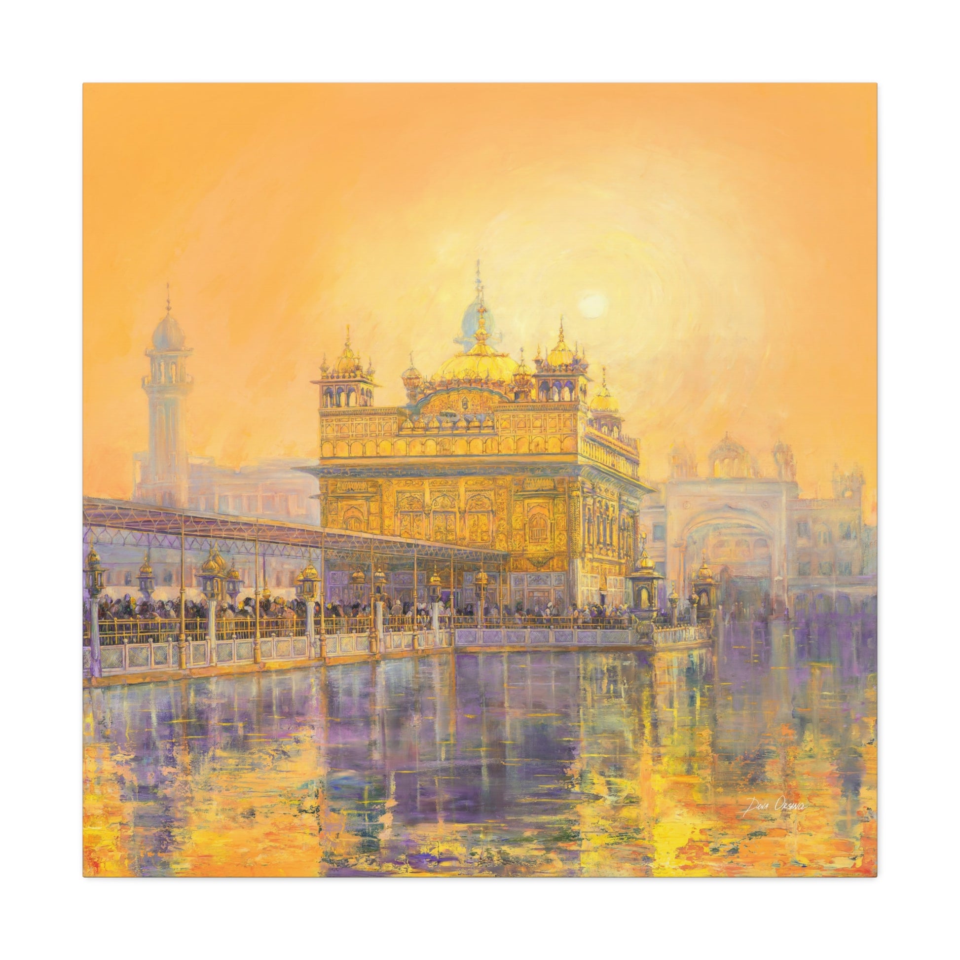 When you look at this painting you dissolve in the rich colors of the orange - peach sunset reflected on the holy water of the Golden Temple. The whole picture radiates a Golden aura in the energy of which even the huge number of visitors in front of the main entrance to the Temple seem naturally calm. If you look closely you can see Guru Gobin Singh on horsebackin an ambossed copper panel on the top.