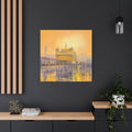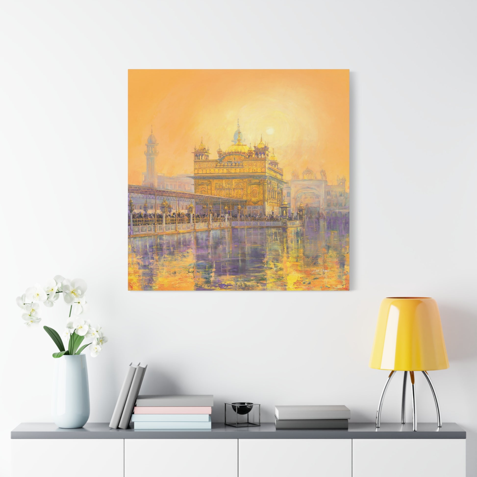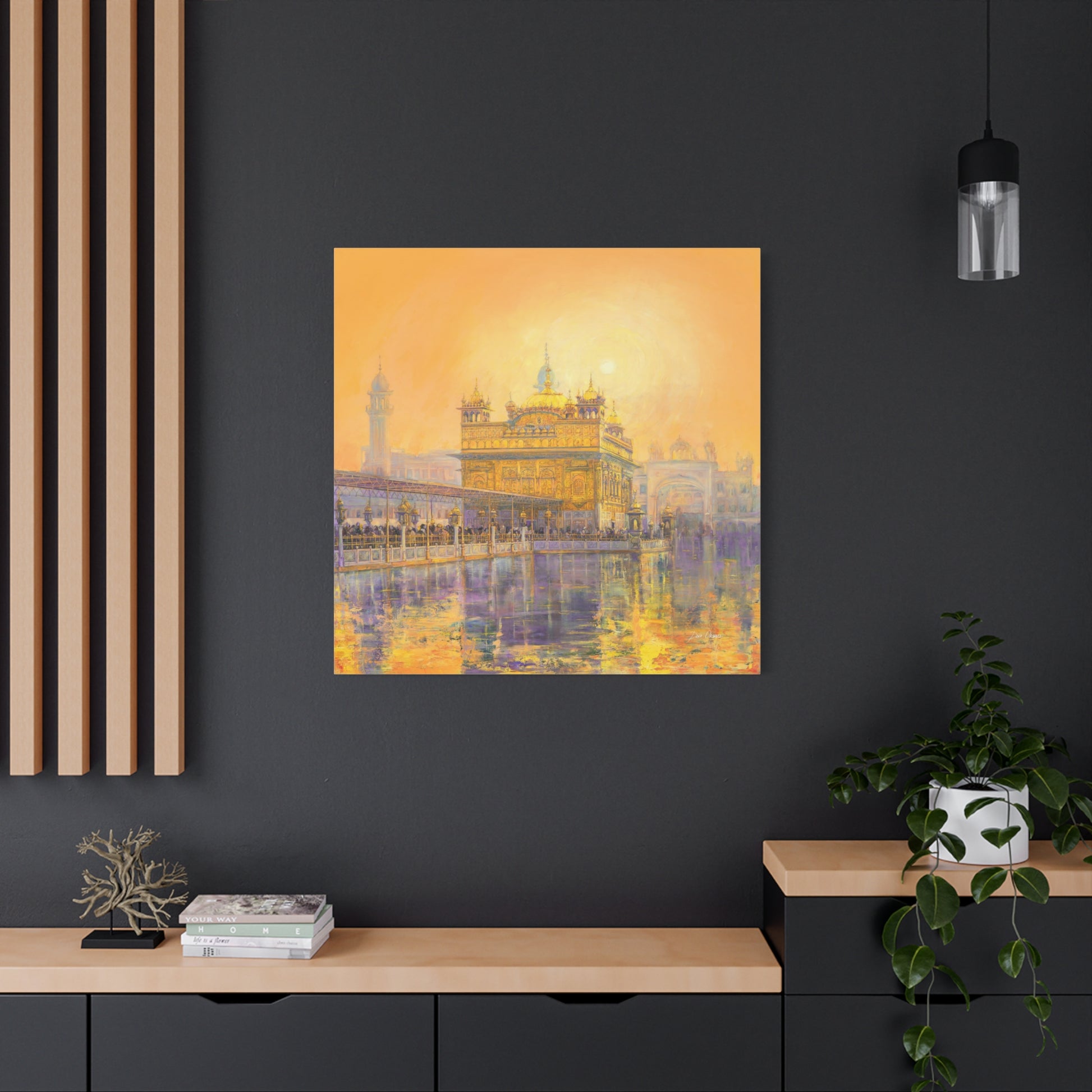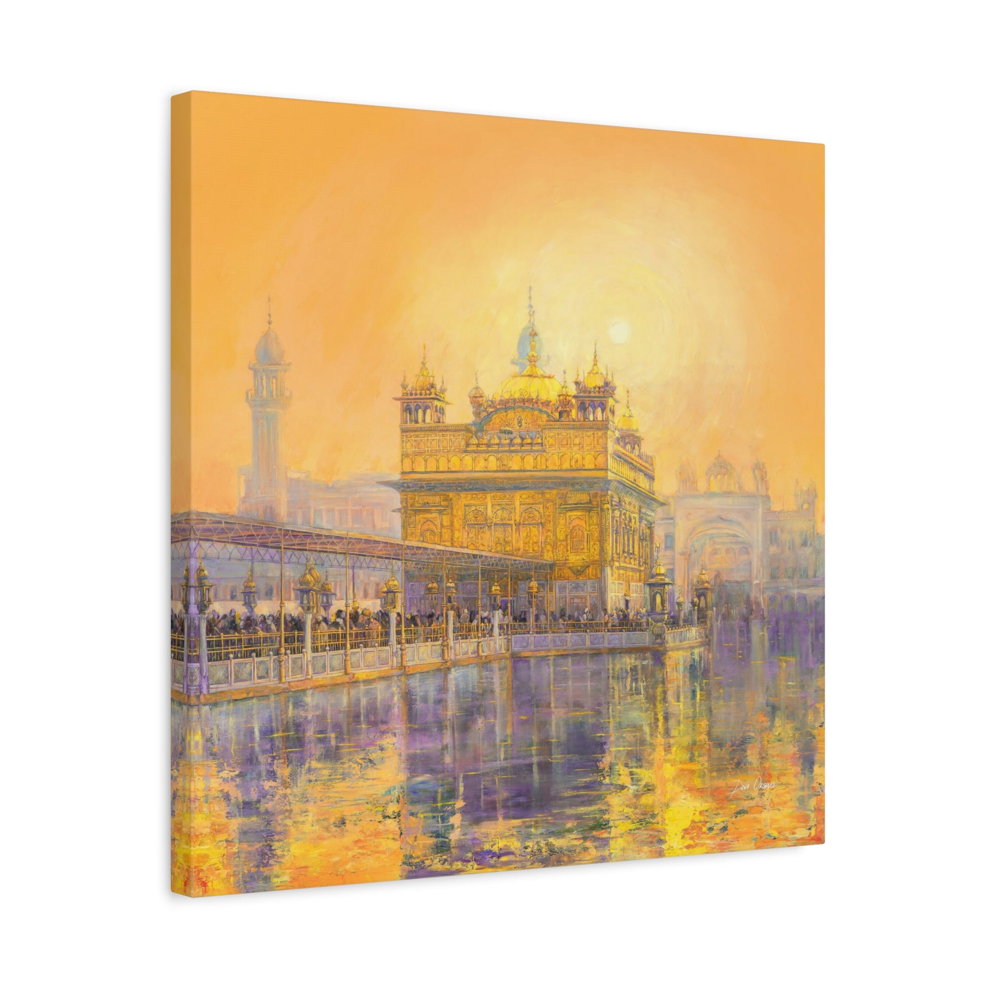 When you look at this painting you dissolve in the rich colors of the orange - peach sunset reflected on the holy water of the Golden Temple. The whole picture radiates a Golden aura in the energy of which even the huge number of visitors in front of the main entrance to the Temple seem naturally calm. If you look closely you can see Guru Gobin Singh on horsebackin an ambossed copper panel on the top.