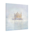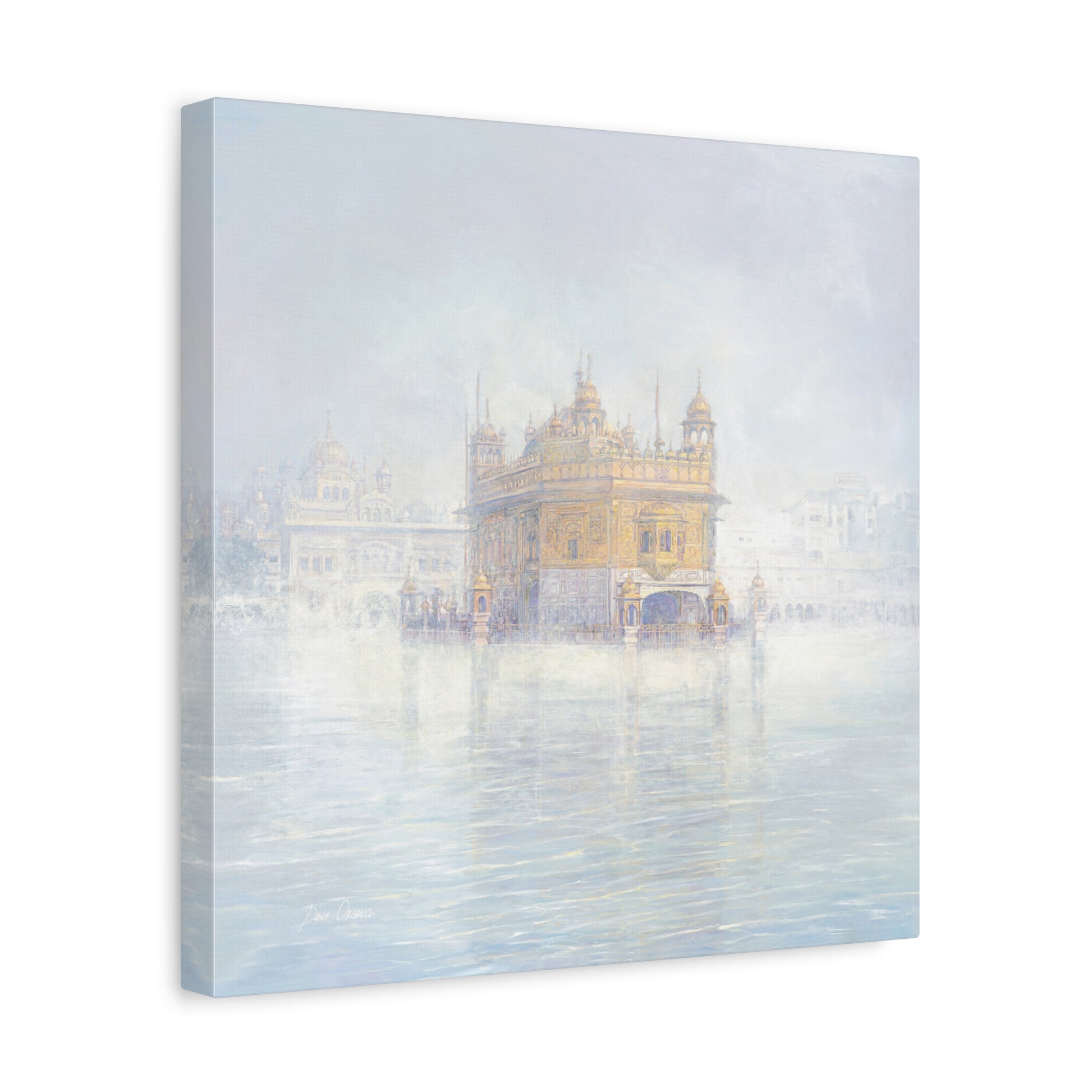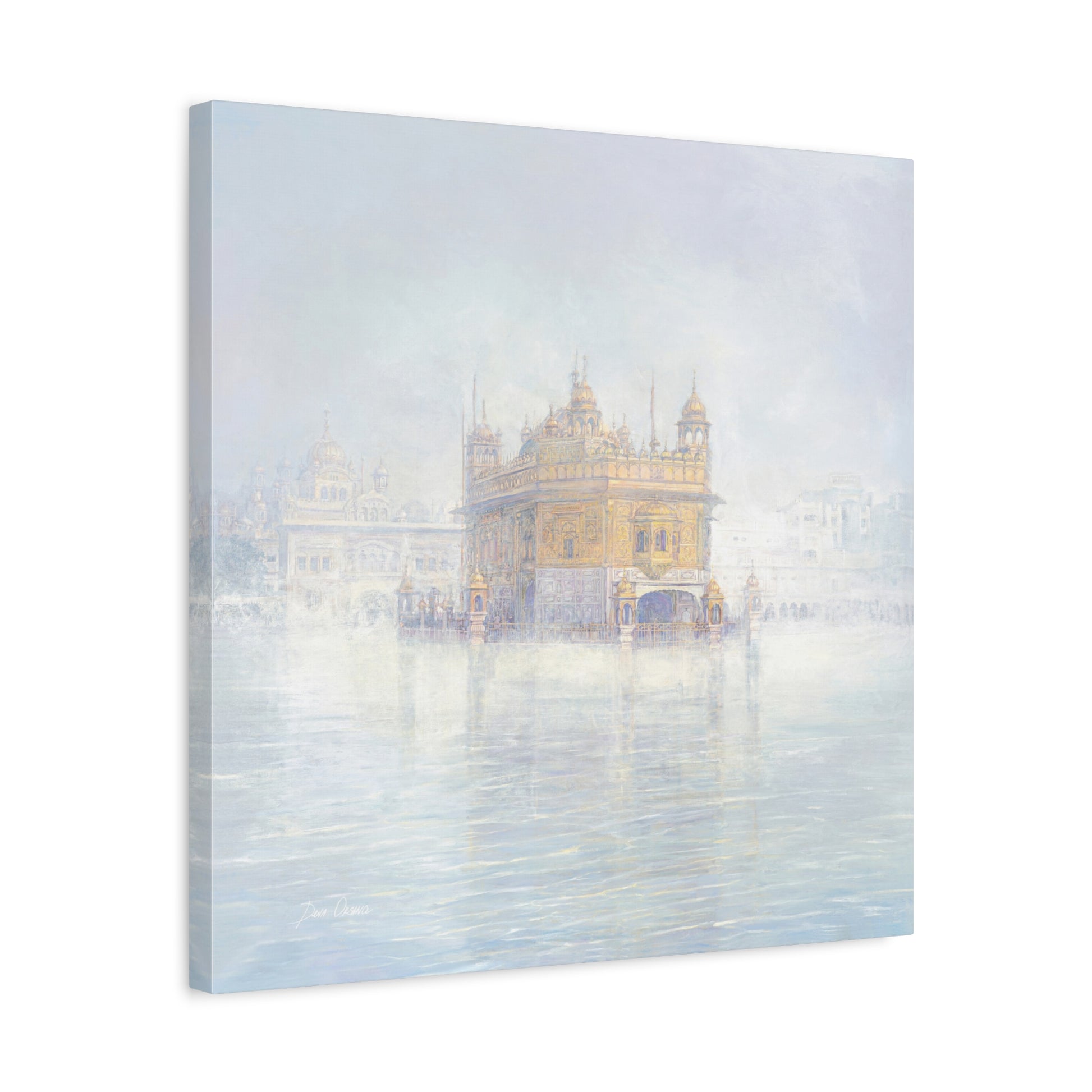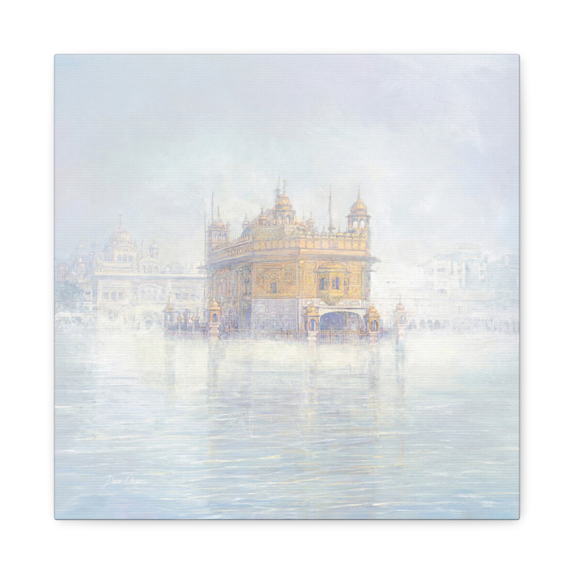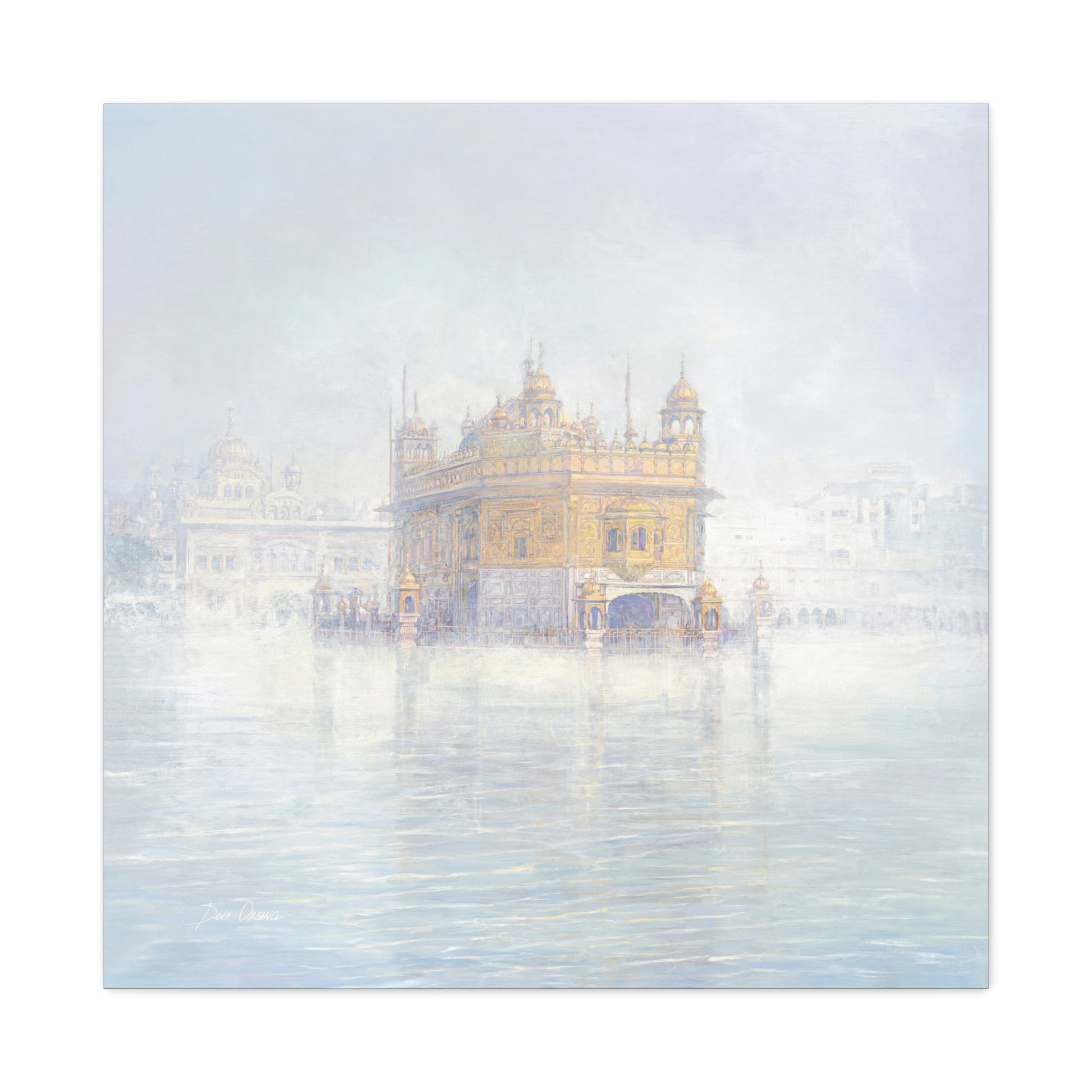 The fog dissolves around the Golden Temple in Amritsar. The morning calm of the awakened city is felt with every brushstroke on the canvas. If you look closely you can see the Guru Nanak on the top panel.