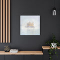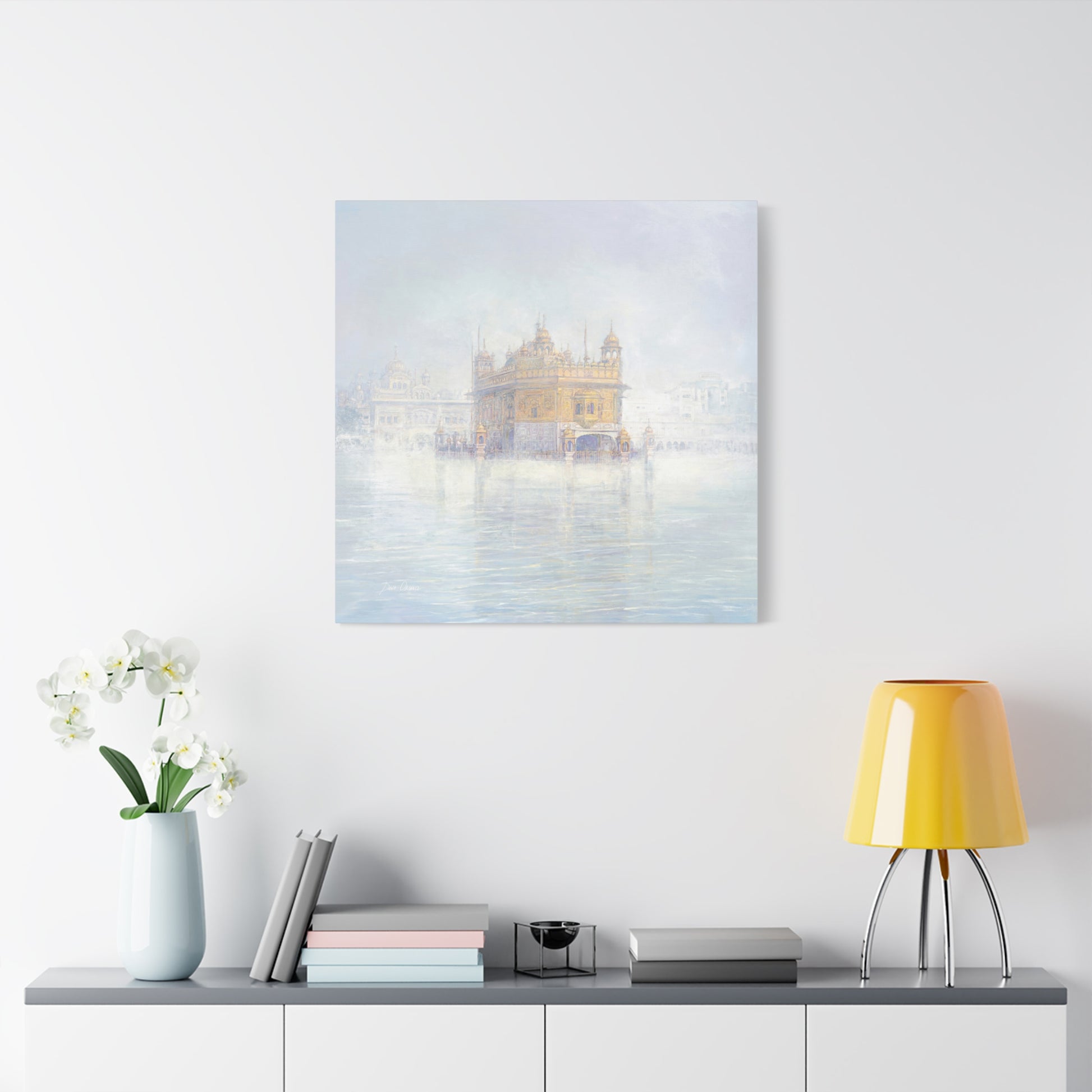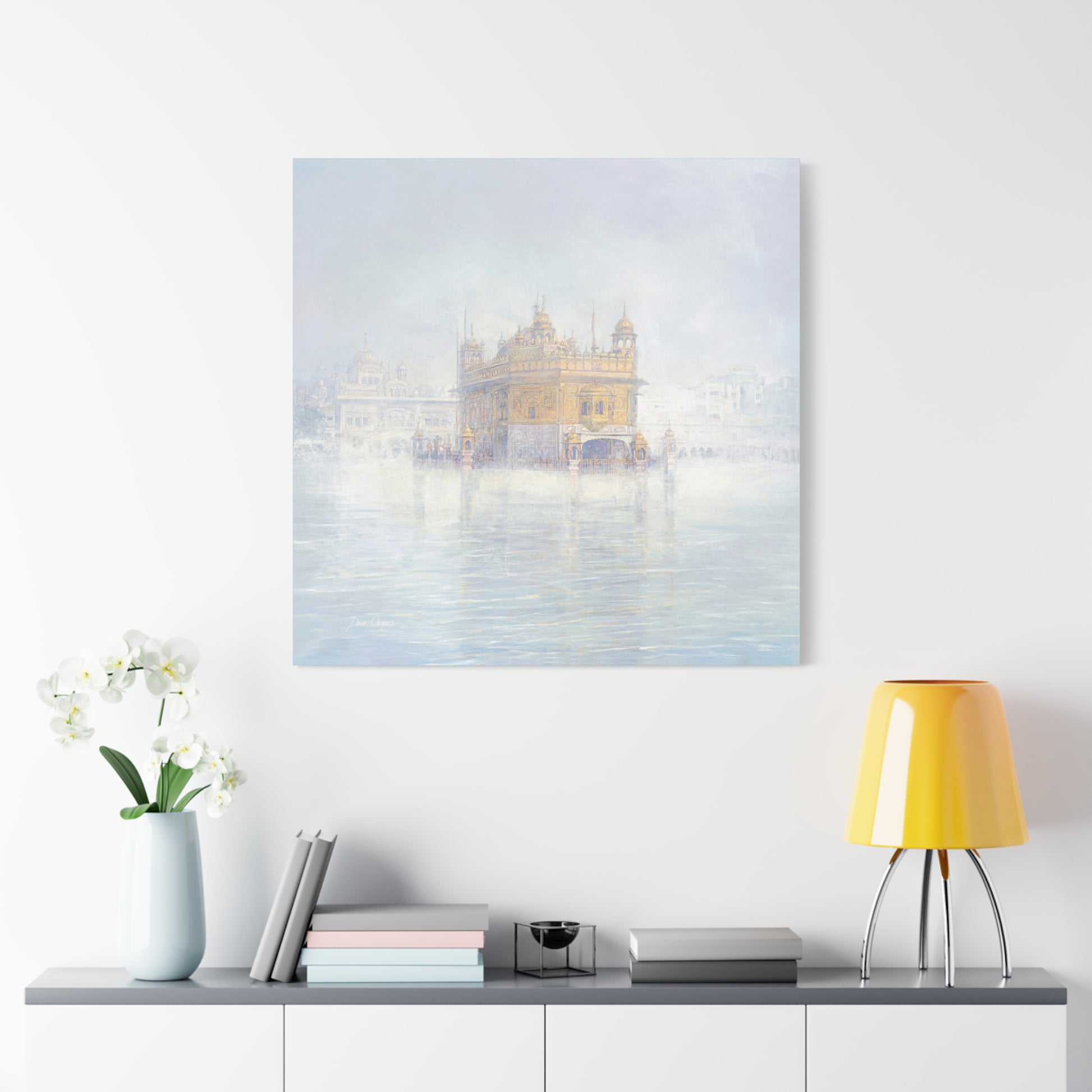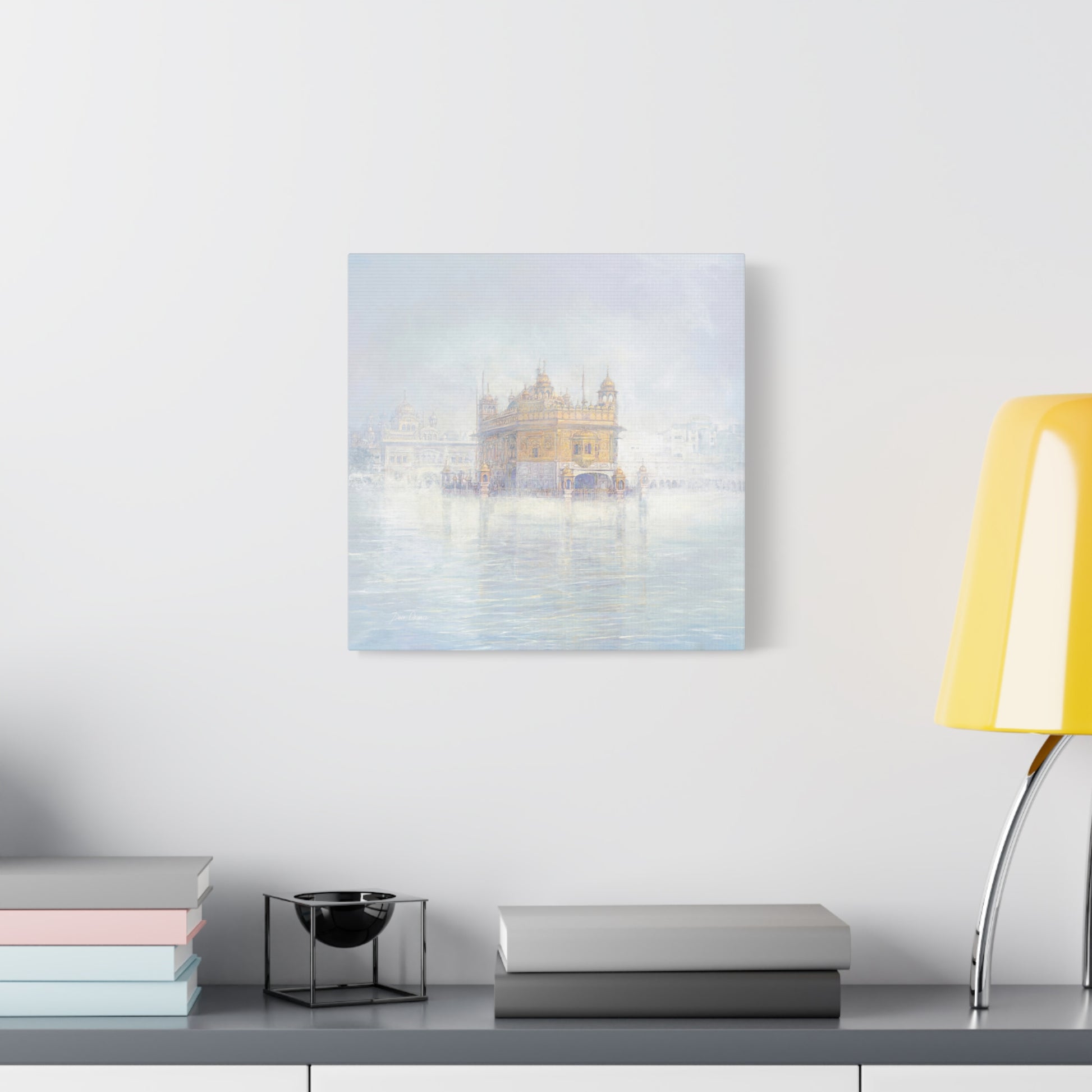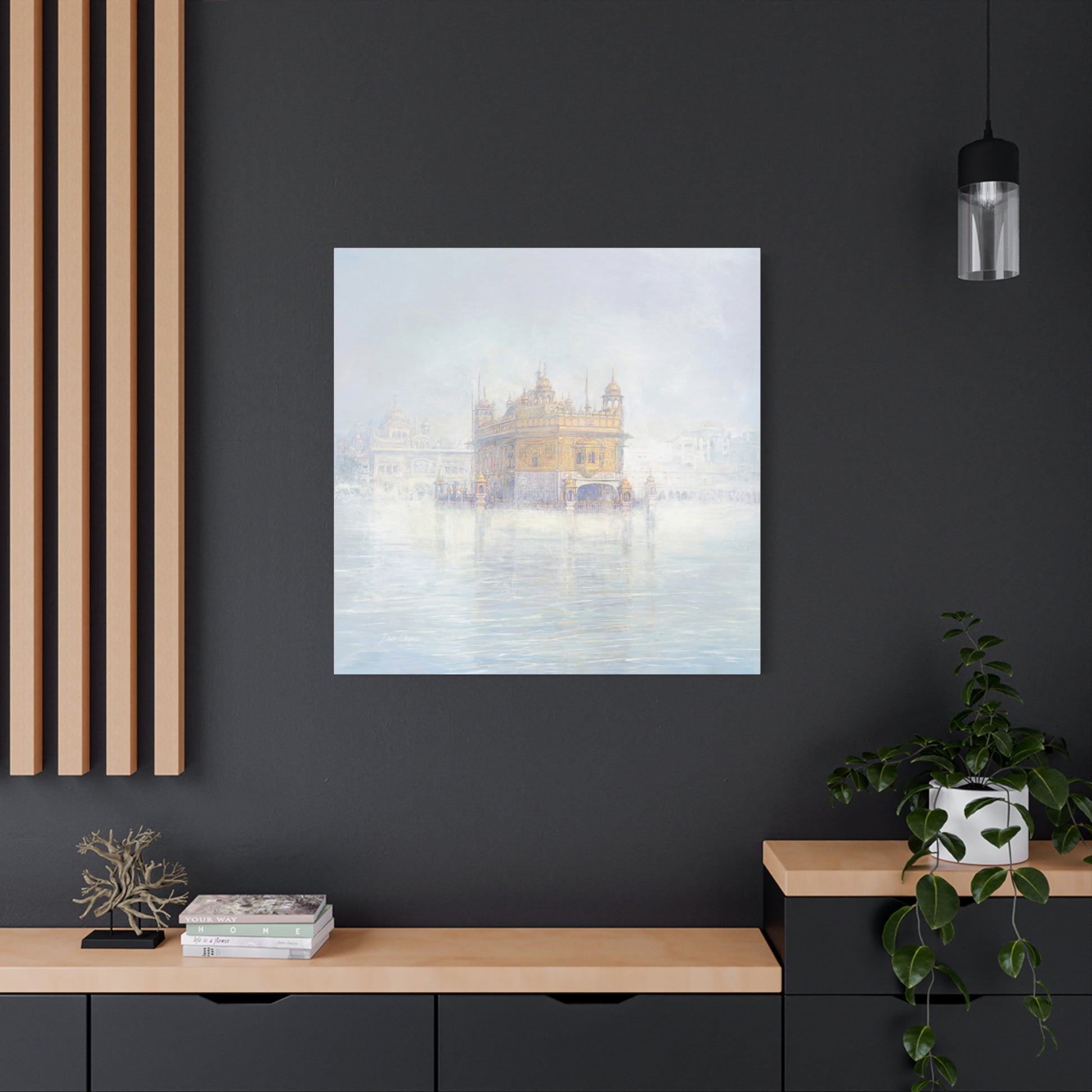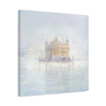 The fog dissolves around the Golden Temple in Amritsar. The morning calm of the awakened city is felt with every brushstroke on the canvas. If you look closely you can see the Guru Nanak on the top panel.