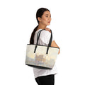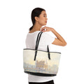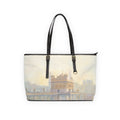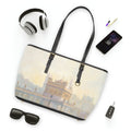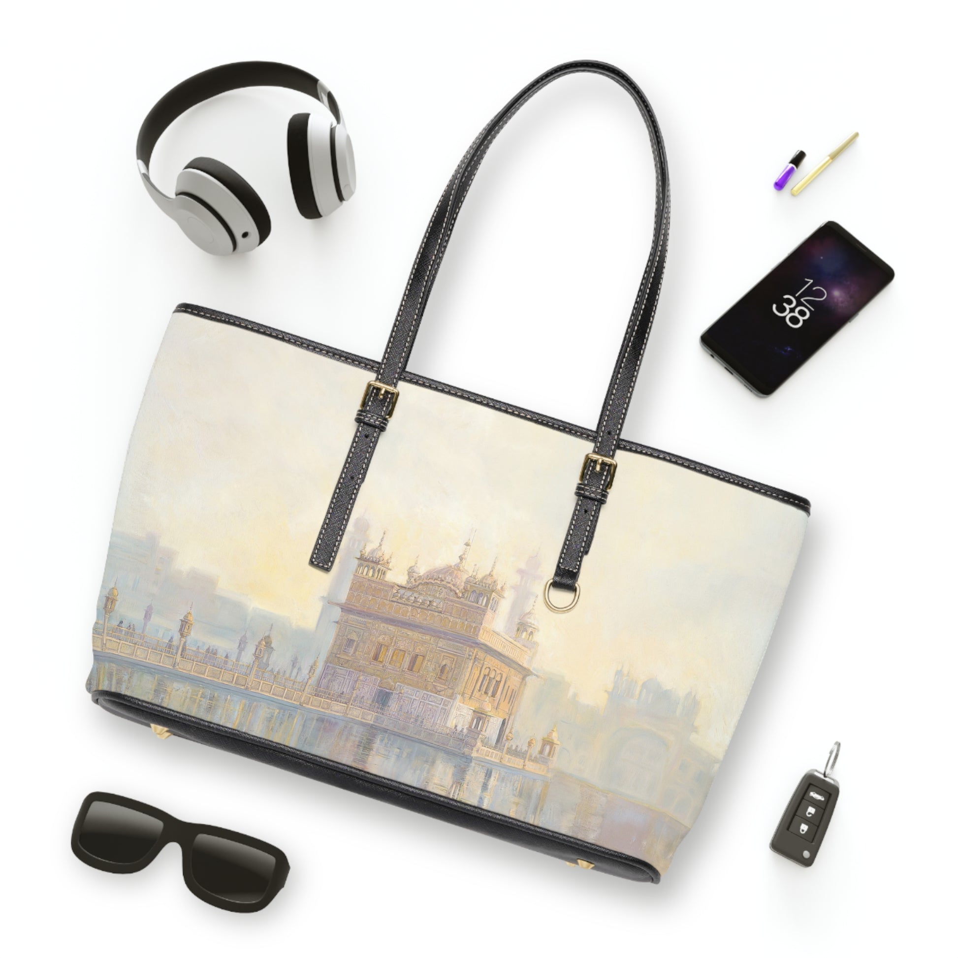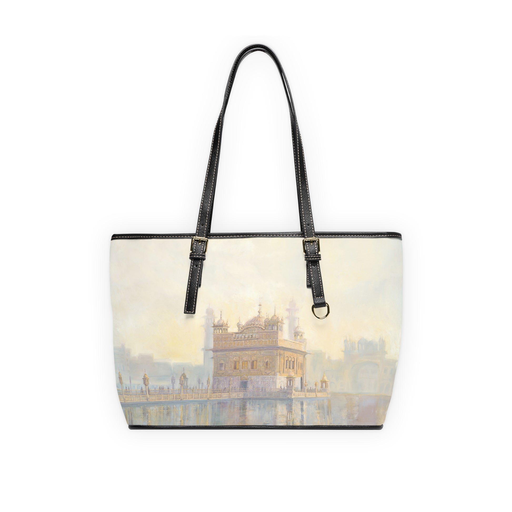 A stylish and spacious shoulder bag featuring a painting of the Golden Temple in Amritsar with golden warm morning colors.